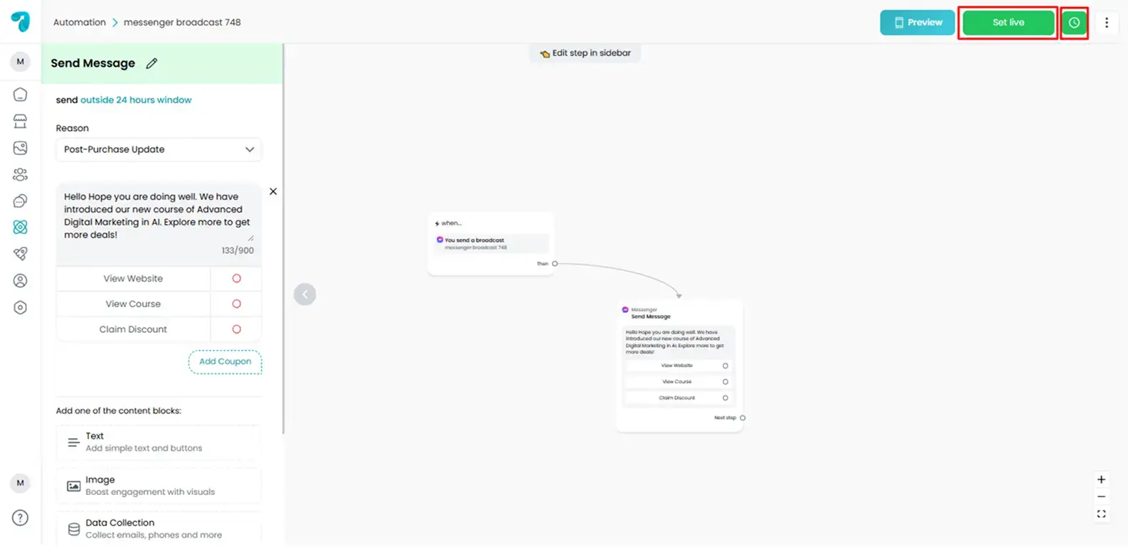 Important: Ensure your broadcast message is valid, clear, and properly formatted to avoid message rejection or potential blocking from Meta.