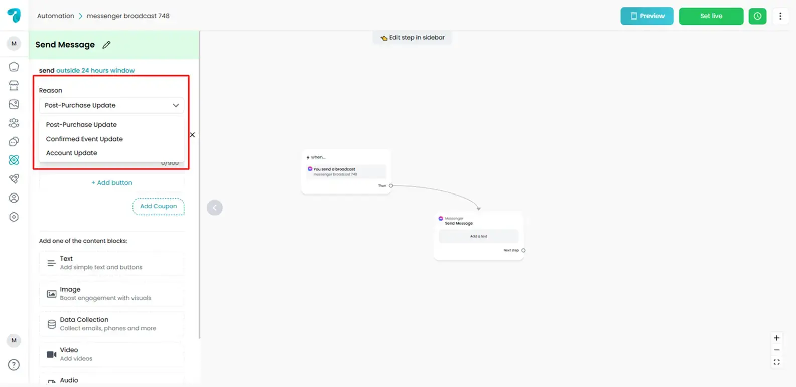 Important: Reflys Messenger Broadcast supports non-promotional broadcasting, so every message you send must be informational and value-based.