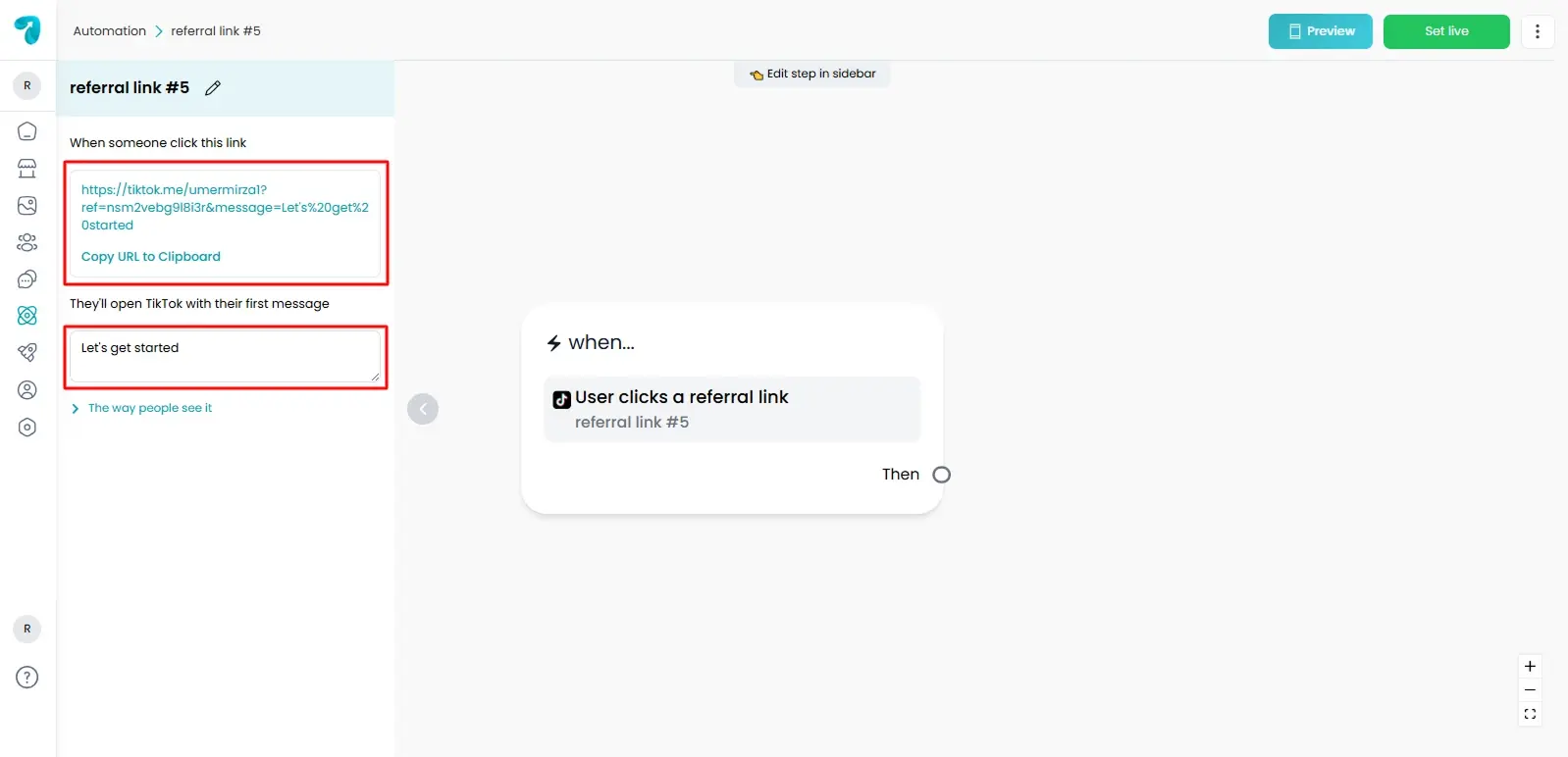 The Tik Tok Ref URL trigger assists you in a conversation beginning anywhere your audience is already engaged with you. After a single tap and a pre-recorded message, you can become a part of your TikTok chat and rely on your automation.