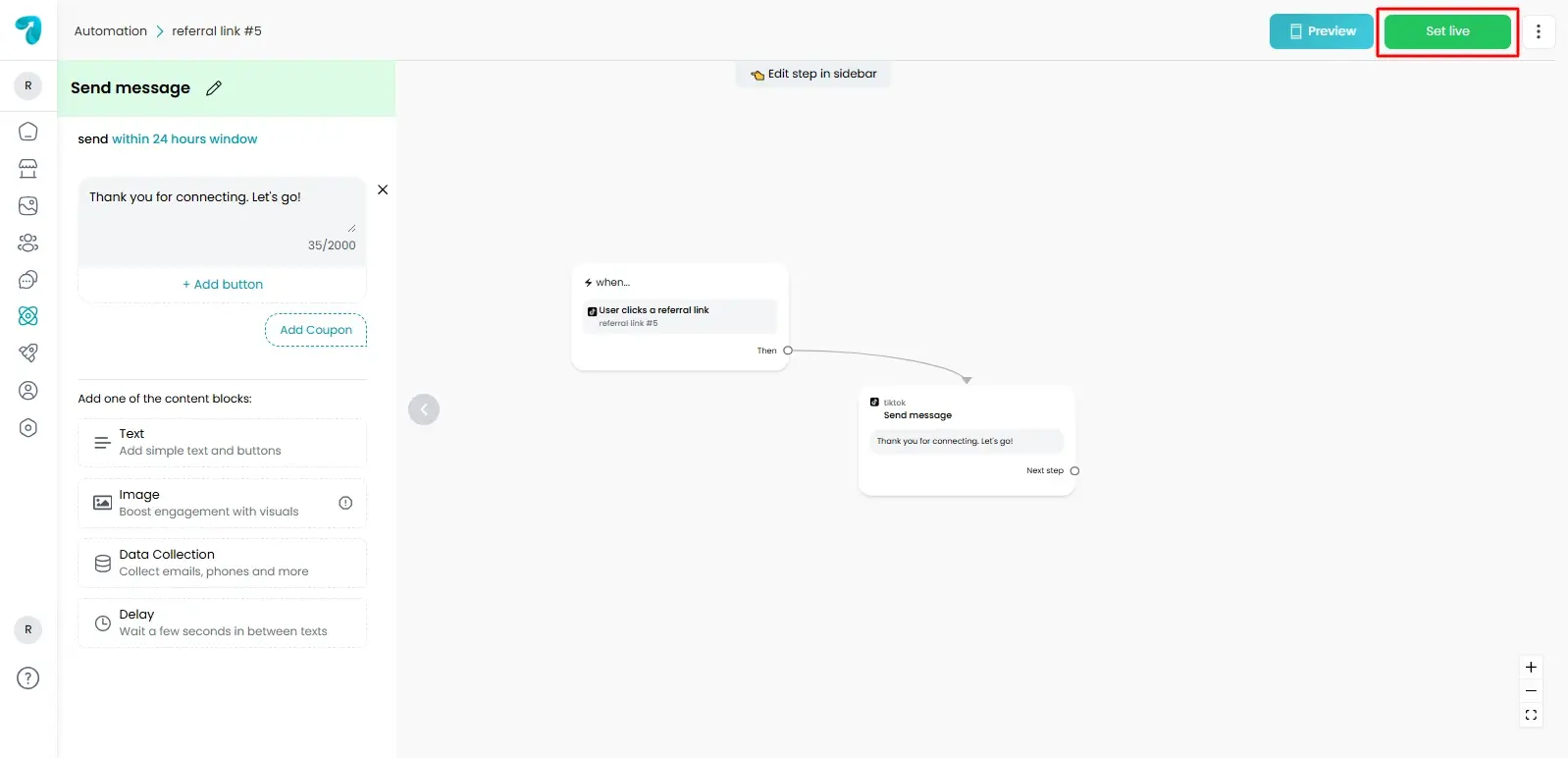 After setting everything, click ‘Set Live’ to activate the flow.