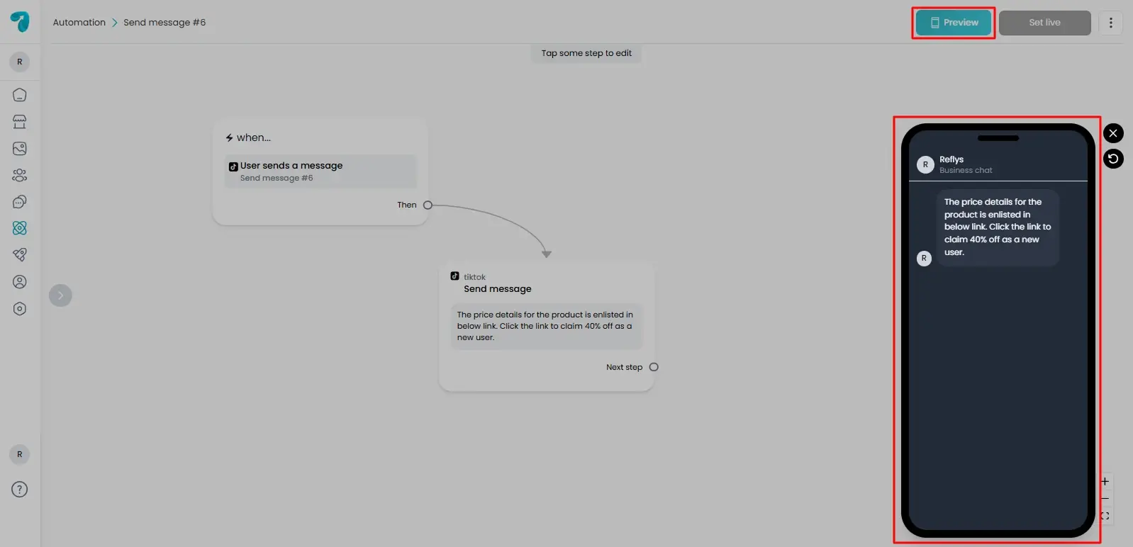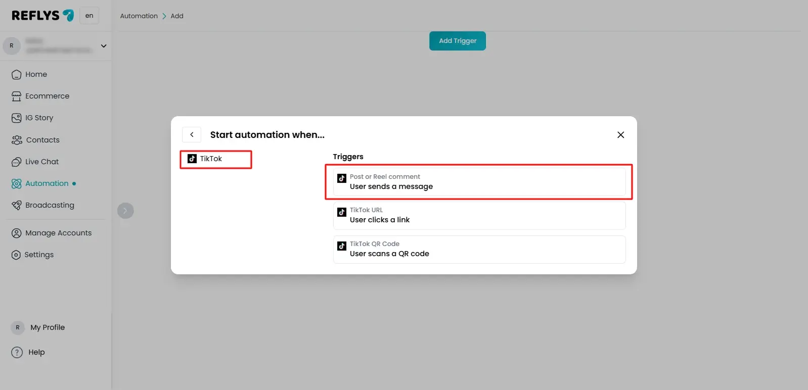 How to Set up TikTok Automation in Reflys: User Sends a Message