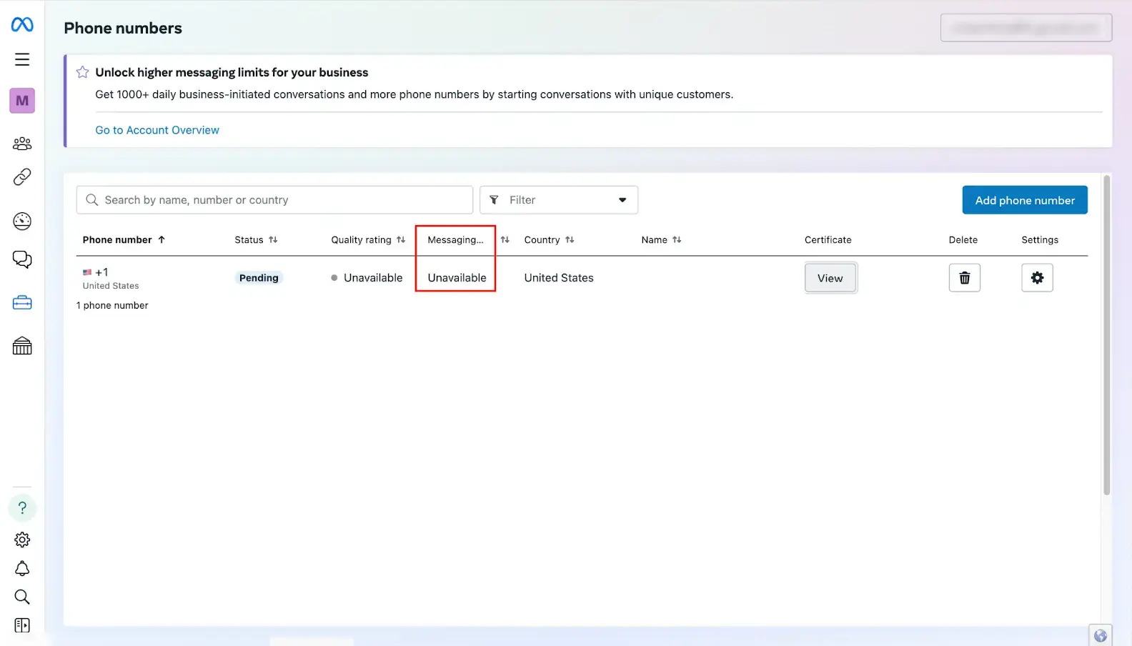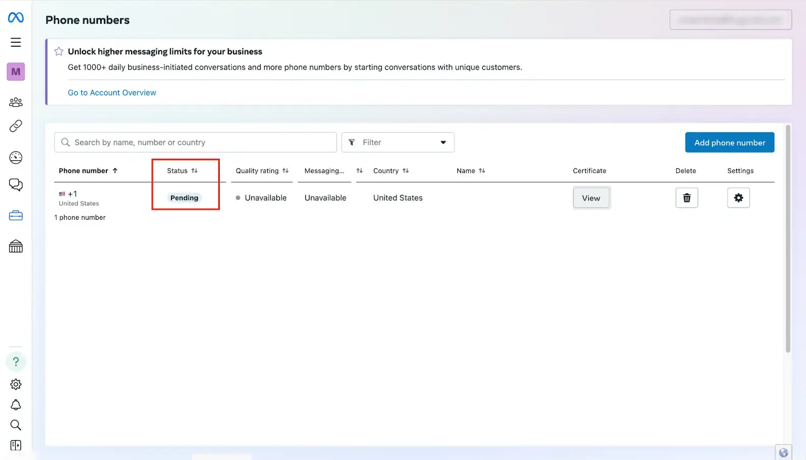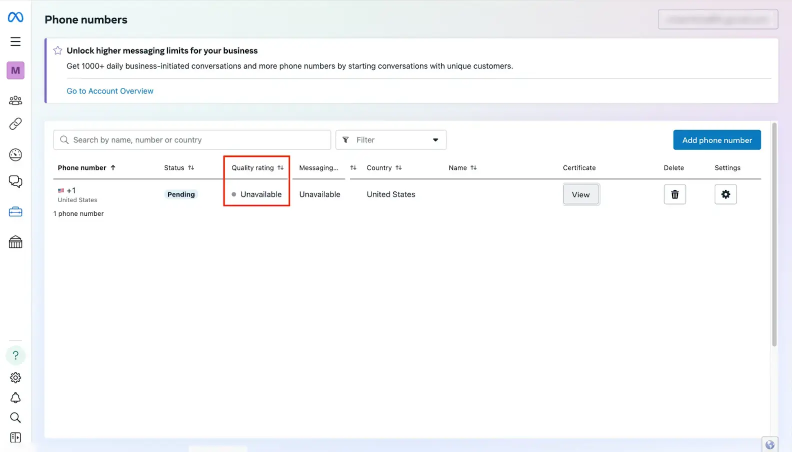 In the same place where you check your messaging limit and quality rating, you’ll also see the status of your phone number.