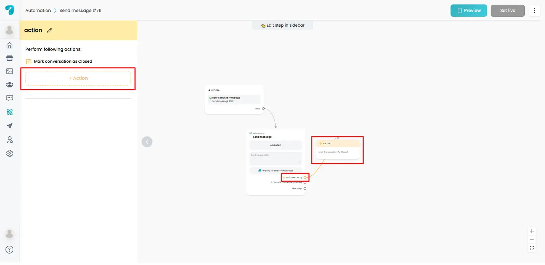 Actions are essentially usable steps that you can integrate into your automation flow. They let you decide the contact data flow, conversation management and connect conversations effectively throughout social media, including WhatsApp, Facebook, or Instagram.