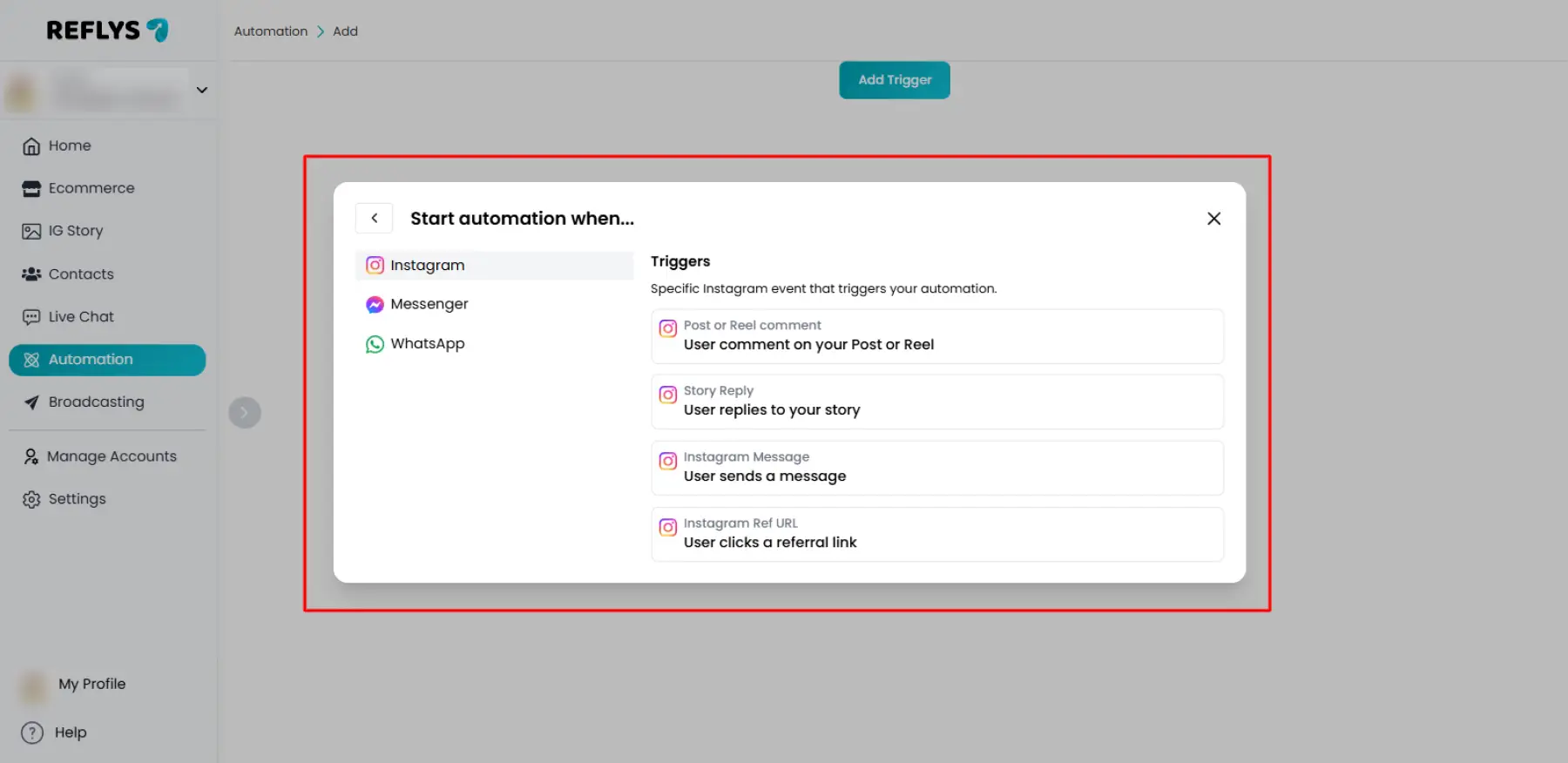 - Choose a trigger relevant to the selected channel (e.g., keyword, DM, quick reply, etc.).