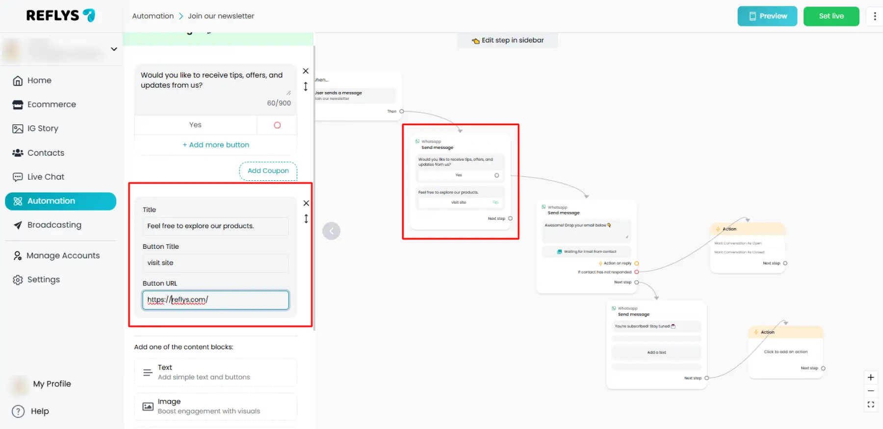 Buttons make your flows tappable and clear. In Reflys, you can add up to 3 buttons per message (on WhatsApp, Instagram, and Messenger) and up to 3 buttons per card (on Instagram and Messenger), with multiple cards per carousel. This guide explains where and how to add buttons, what each button can do per channel, and exactly where to capture screenshots.