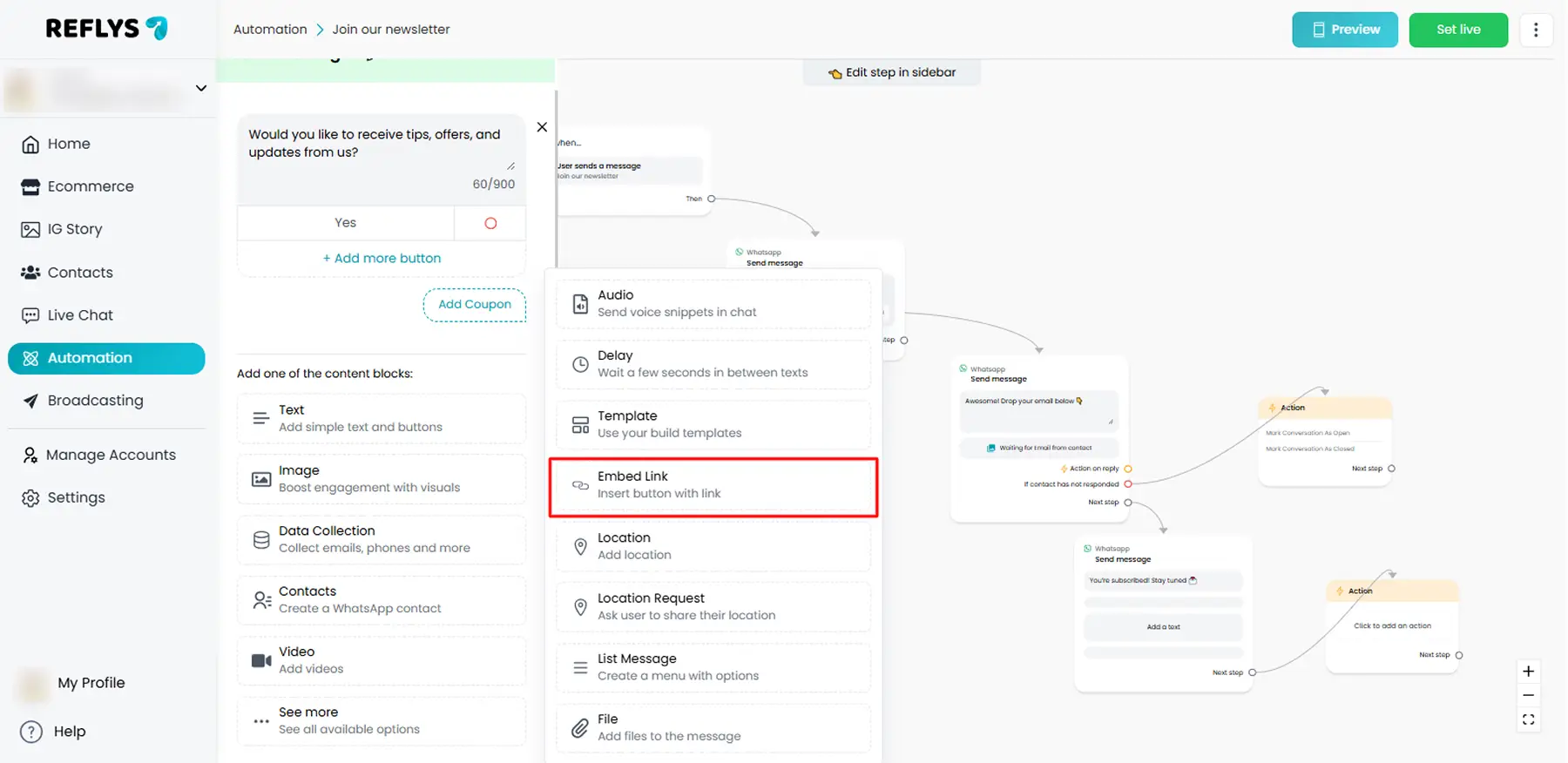 - In a WhatsApp Message block, click + Add Embedded Link