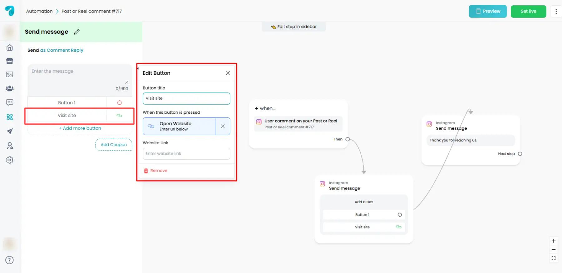 - If Open Website is chosen on Instagram or Messenger, paste the URL.