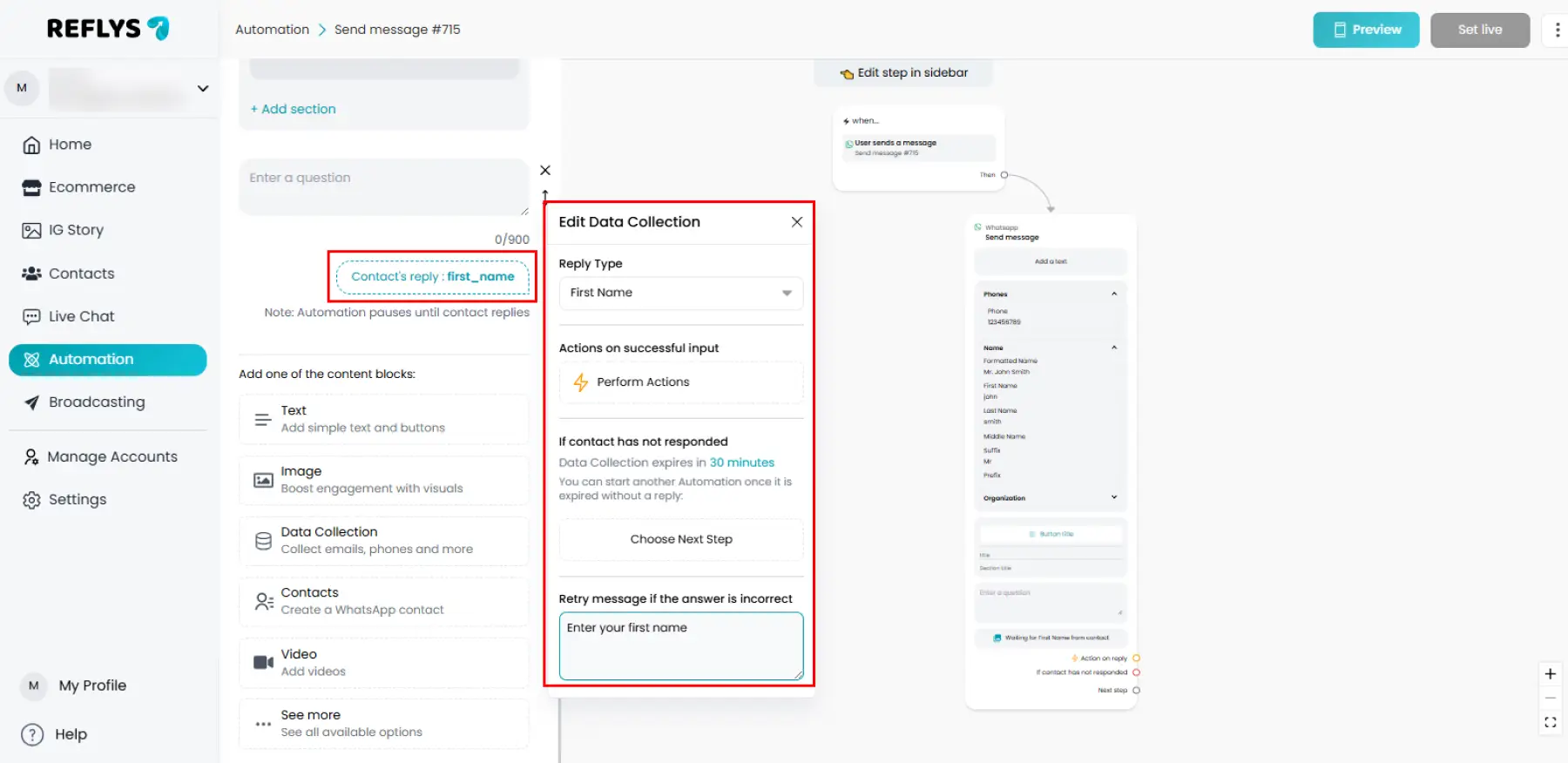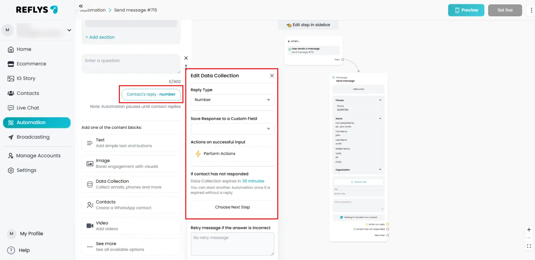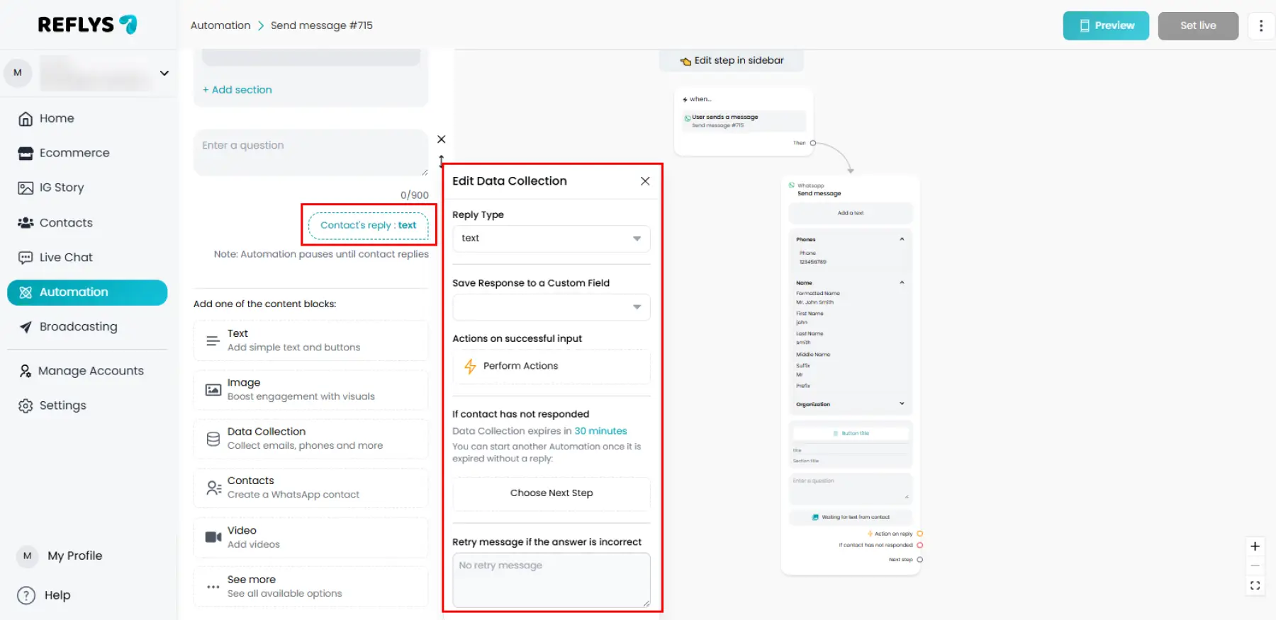In Reflys, the Data Collection Block is used to collect important information from your contacts during automated conversations. For example, if you want to ask users for their name, email, phone number, or a photo, this block helps you ask those questions and save the answers for future use.