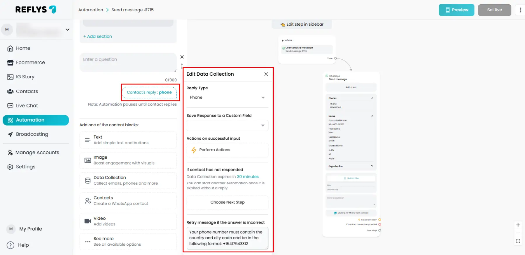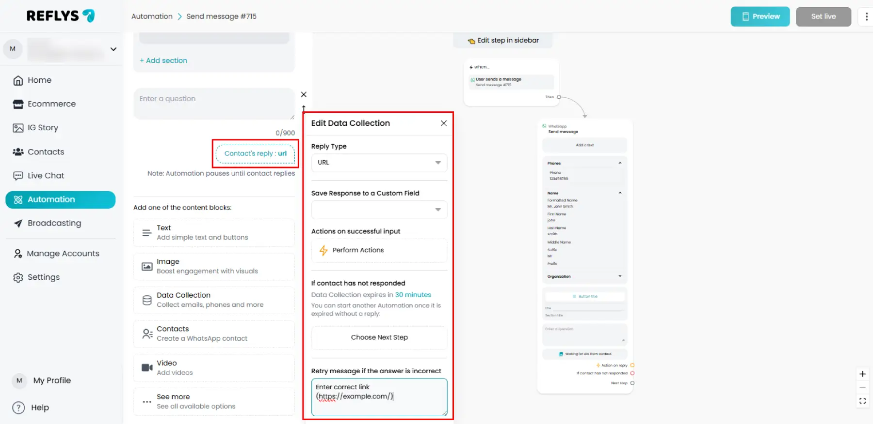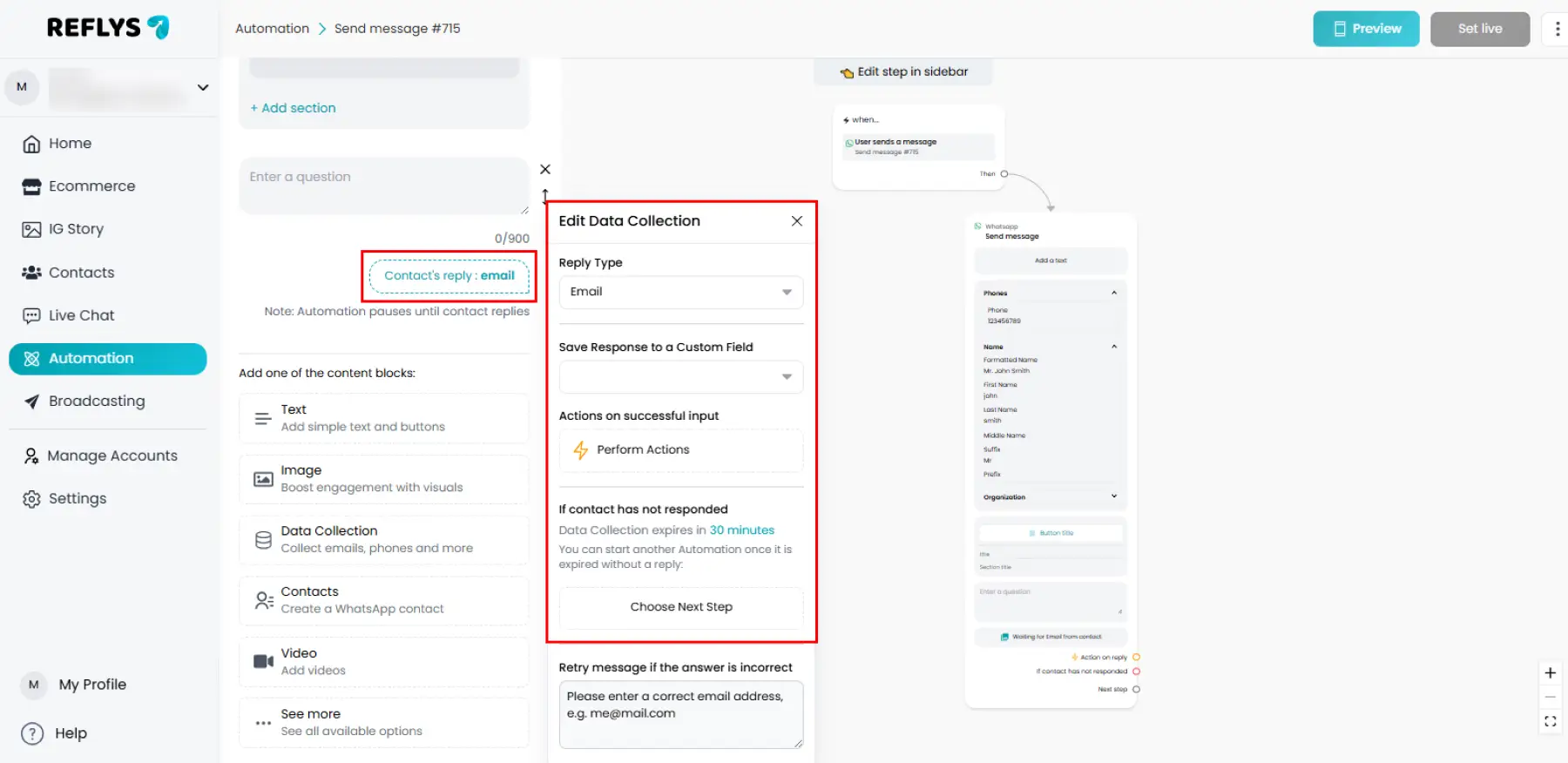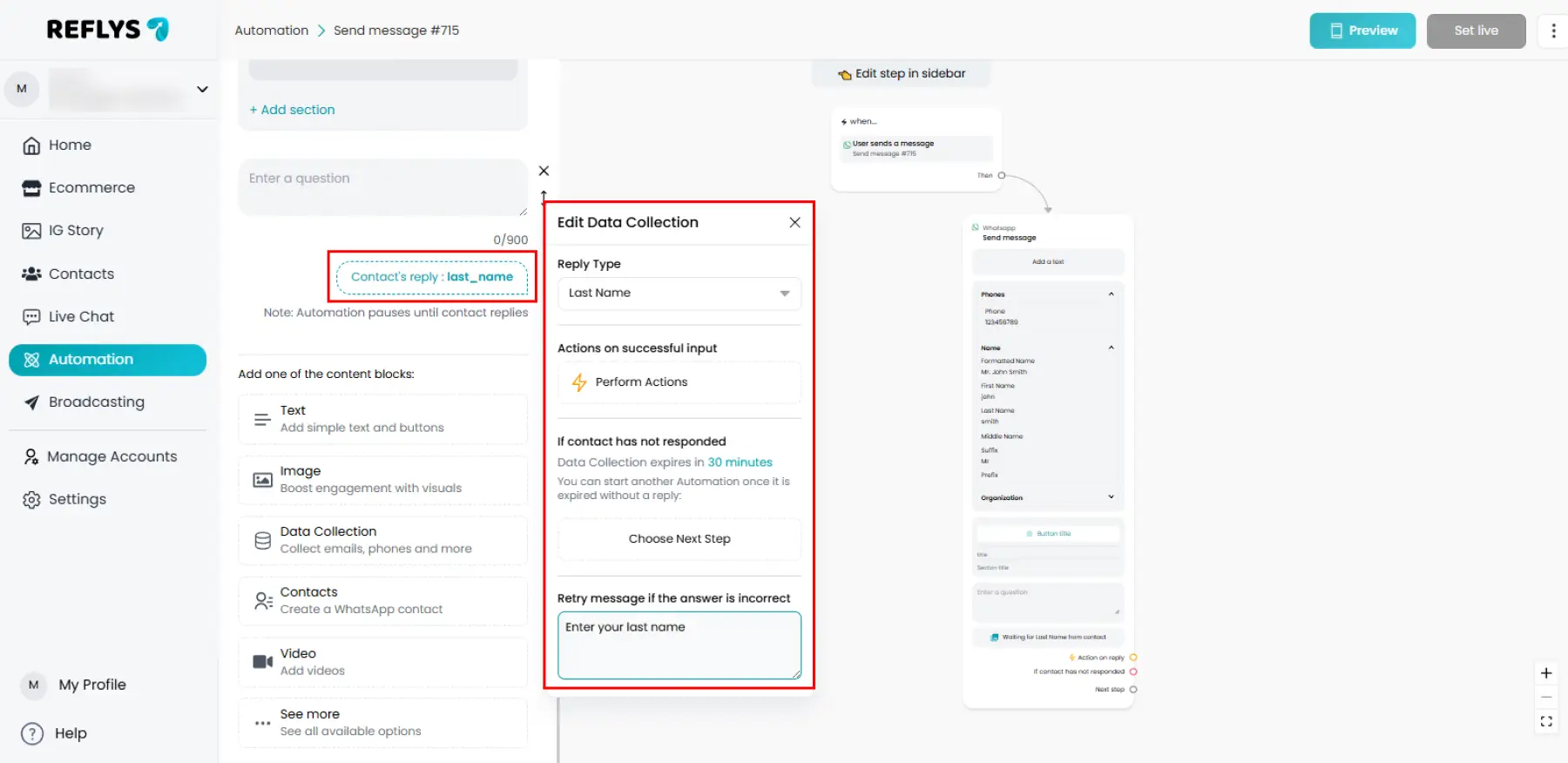 In Reflys, the Data Collection Block is used to collect important information from your contacts during automated conversations. For example, if you want to ask users for their name, email, phone number, or a photo, this block helps you ask those questions and save the answers for future use.