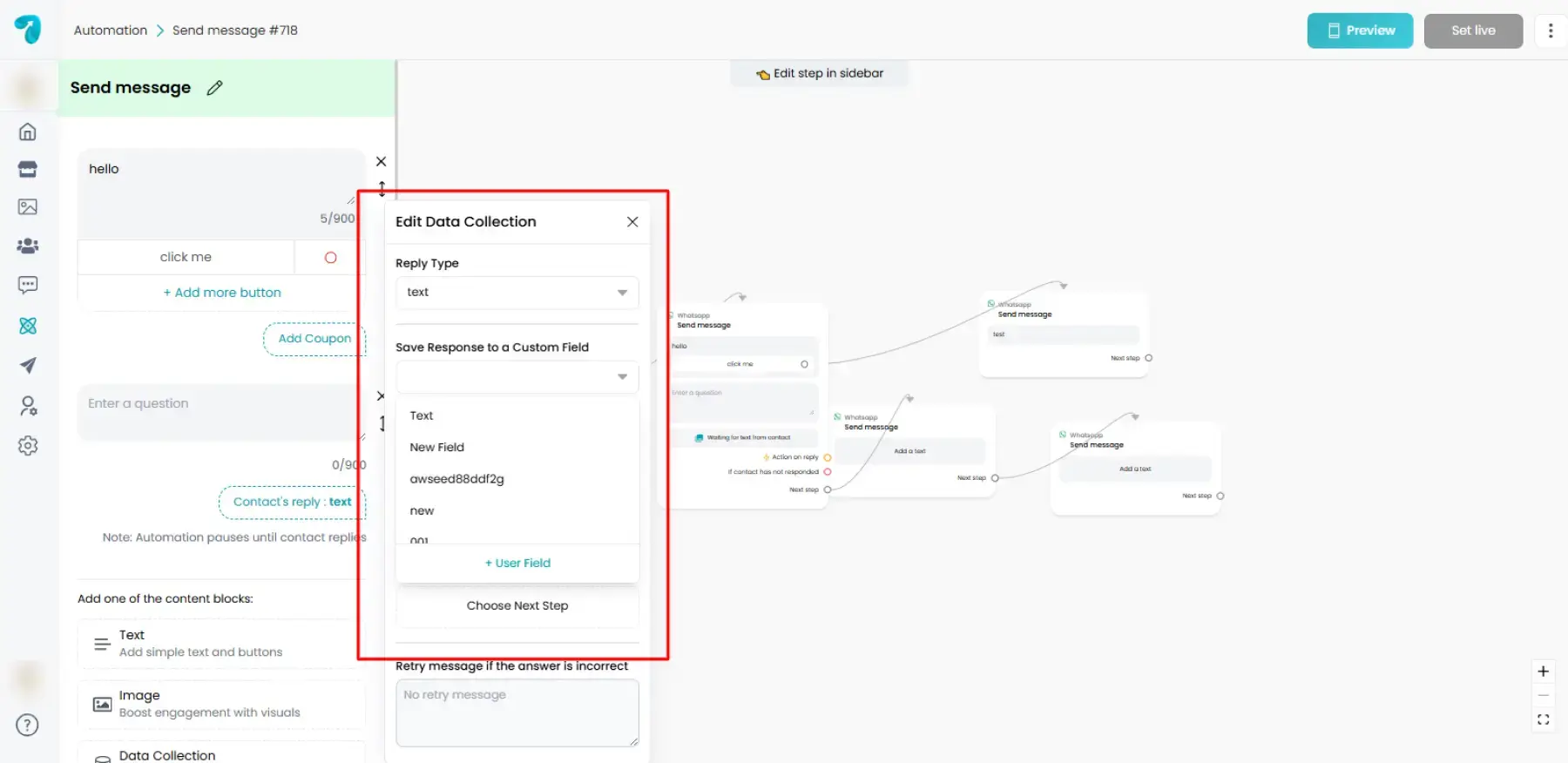 When a user replies to your question, you can save their answer into a Custom User Field or System Field. This is important because it allows you to reuse that information later — for example, in follow-up messages, broadcasts, or personalized content.
