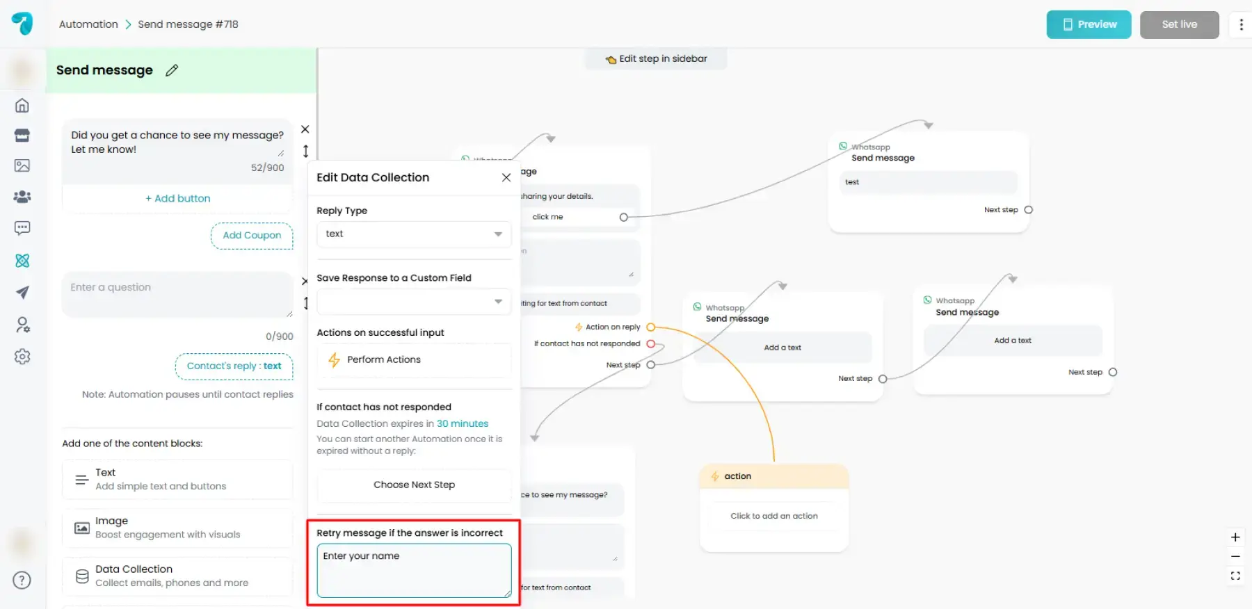 If the reply doesn’t match the input type (for example, if they type letters when you ask for a number), the system will show an error and ask them to try again. This helps you get clean, useful data.