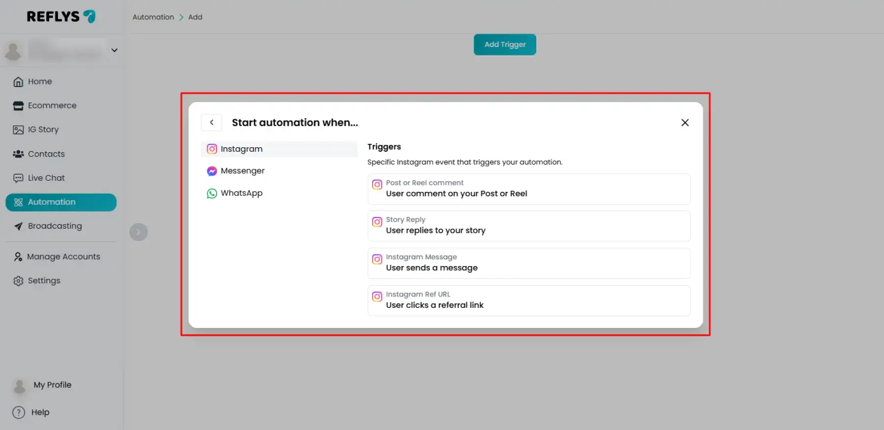 Before creating an automation, choose a channel such as WhatsApp, Instagram, or Messenger. In Reflys, you can set triggers for: