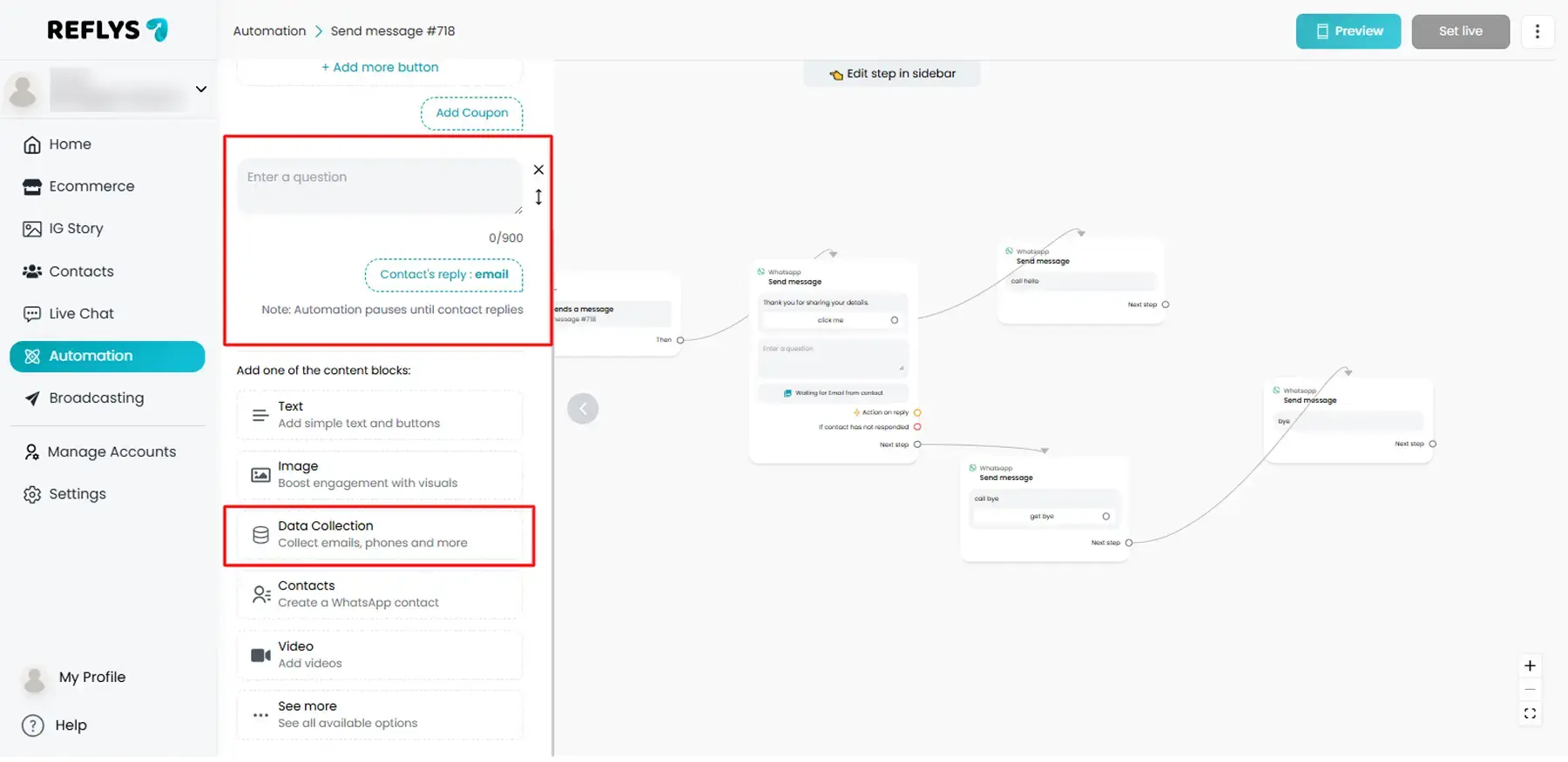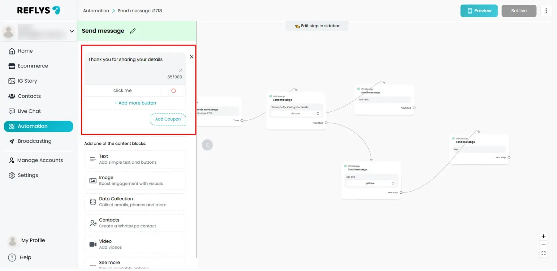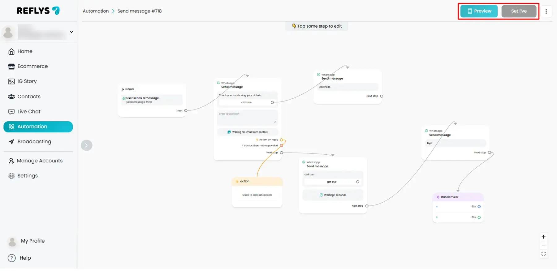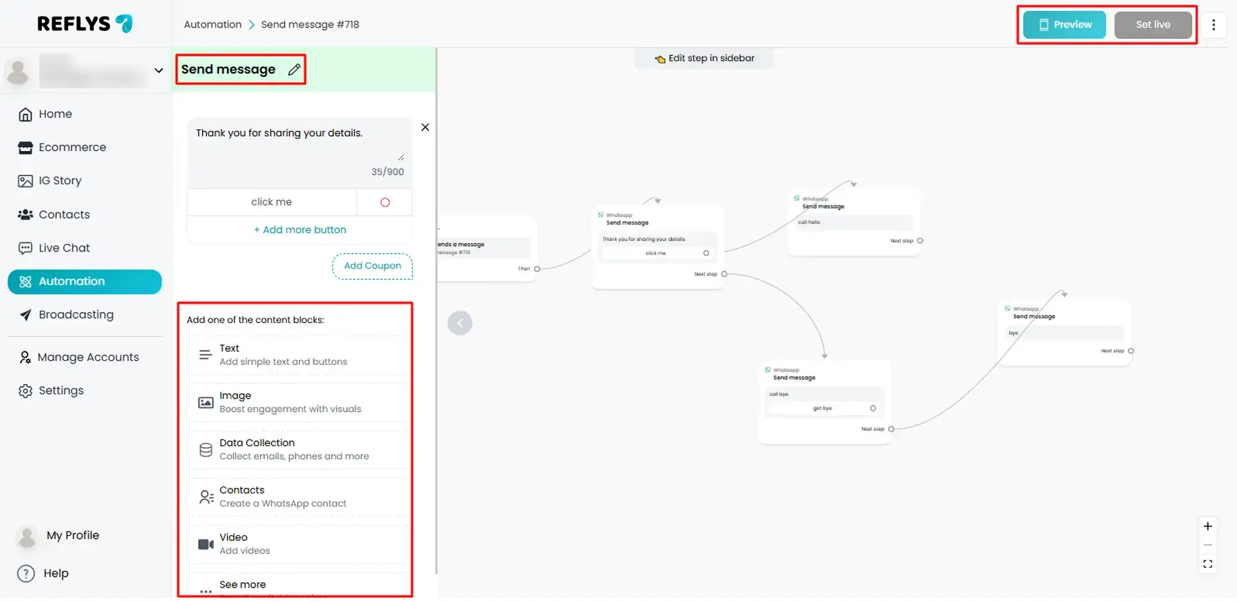 You can create custom flows when replying to Instagram DMs, welcoming WhatsApp contacts, or sending follow-ups after a Messenger interaction by using Reflys Automation Builder.