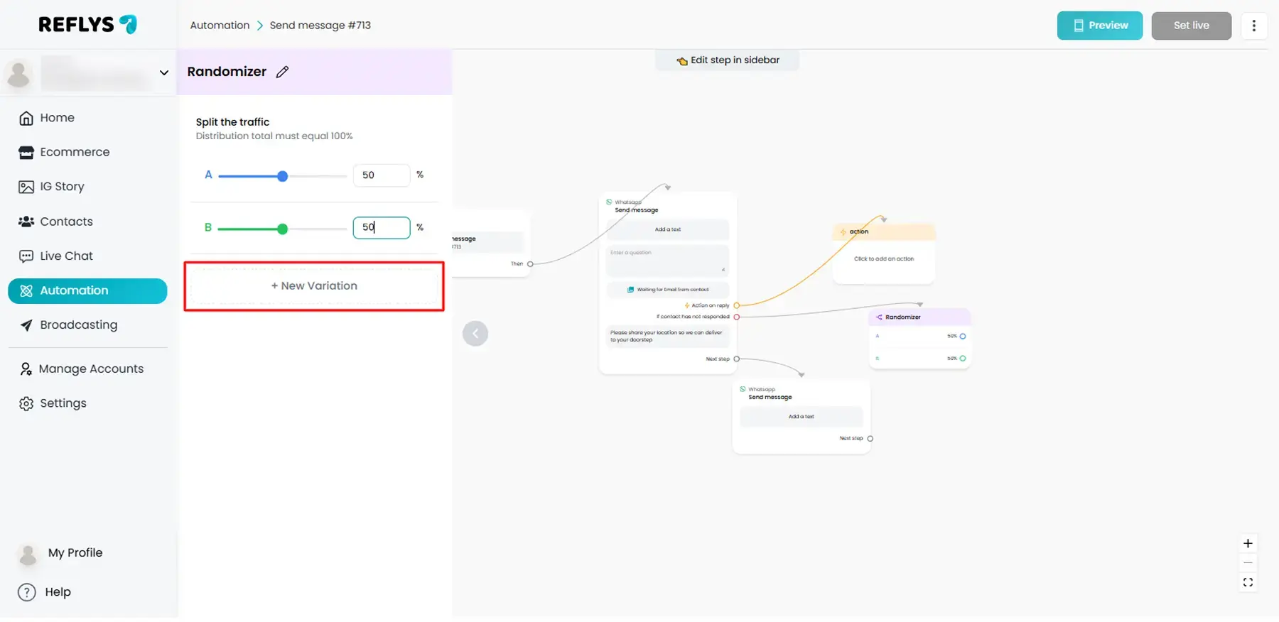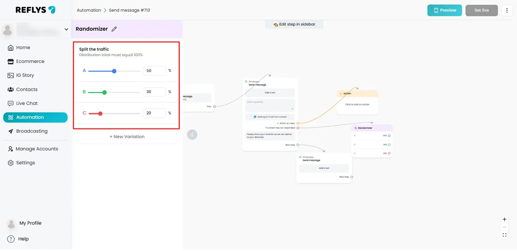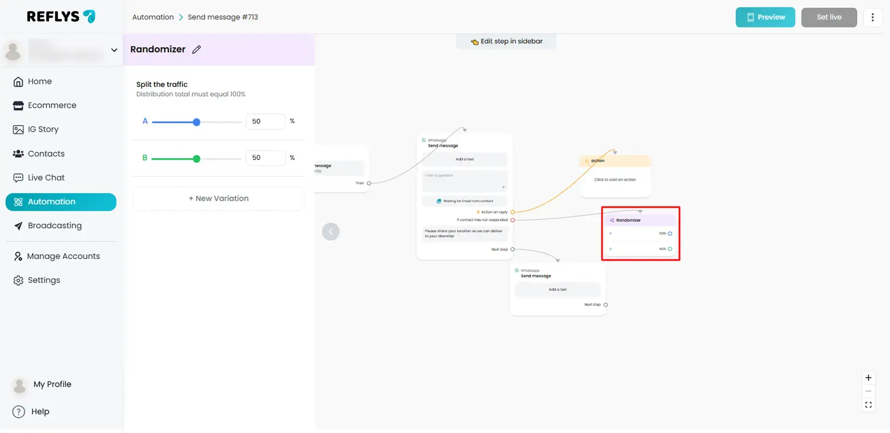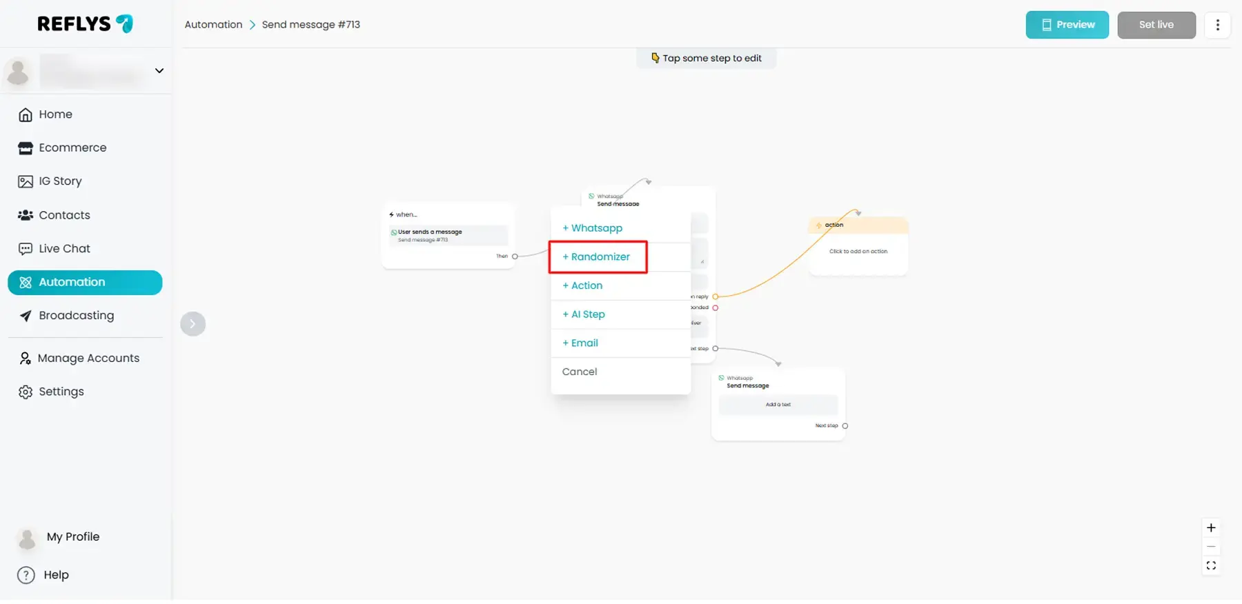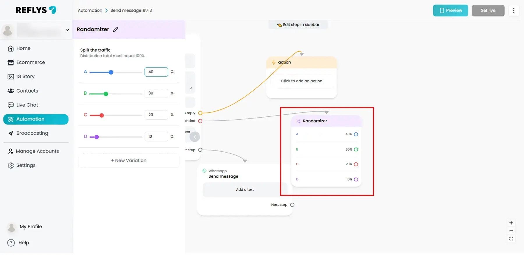 The Randomizer step in Reflys allows you to split your audience into different groups randomly during an automation flow. It is beneficial when you conduct A/B tests, create various contests, or want to provide various experiences to various users.