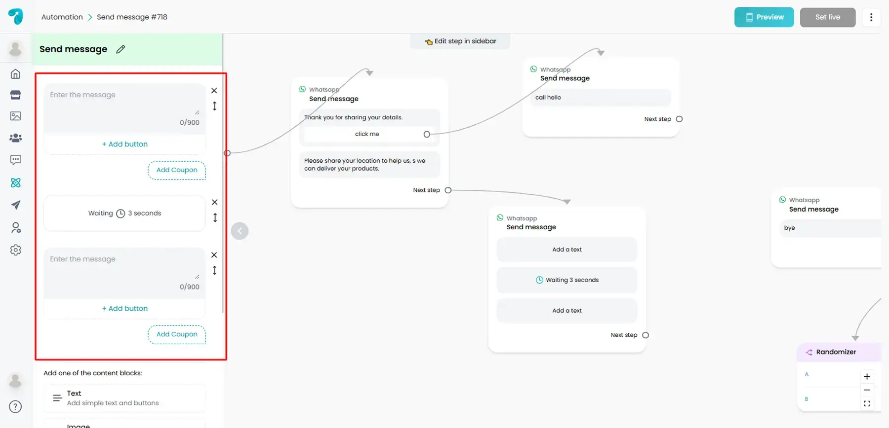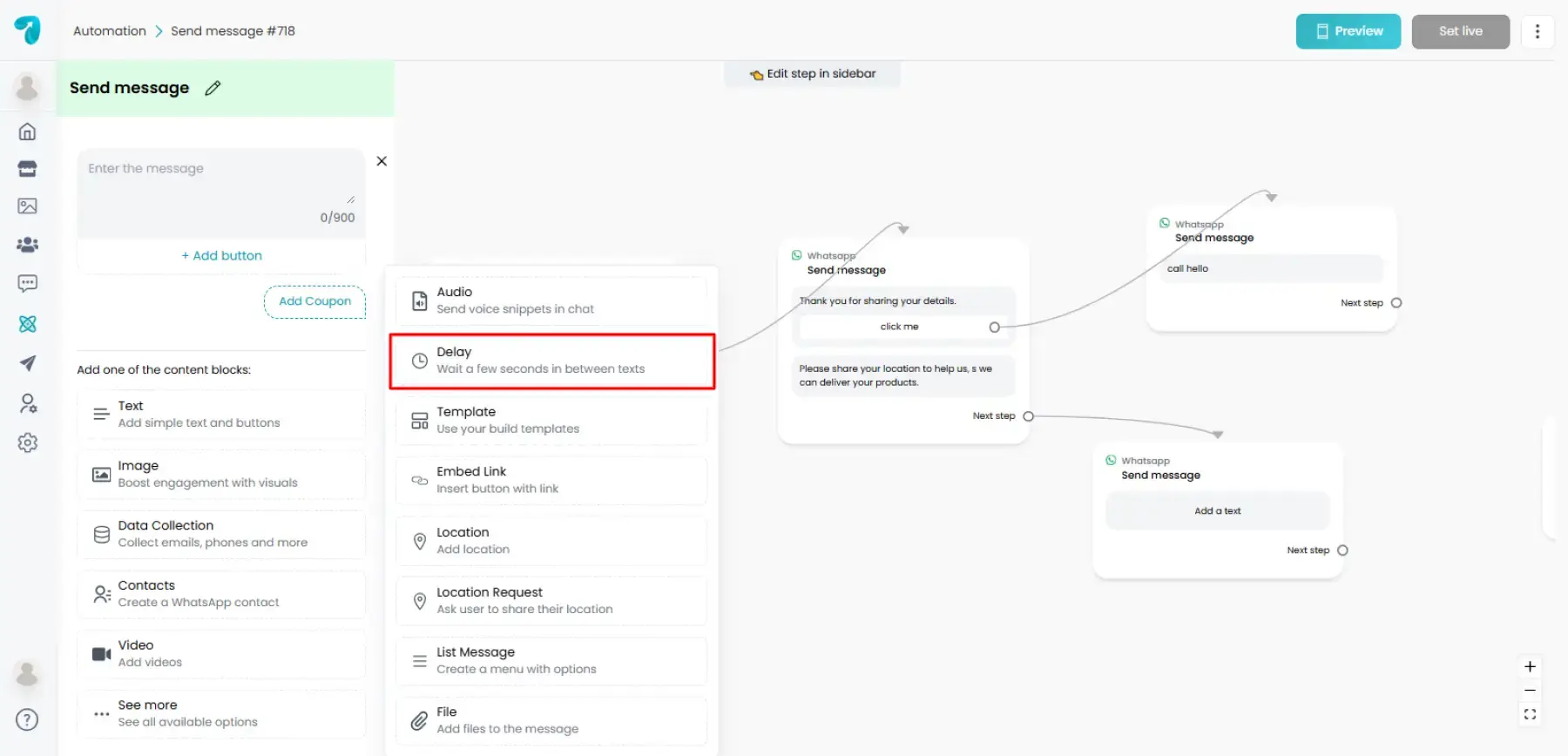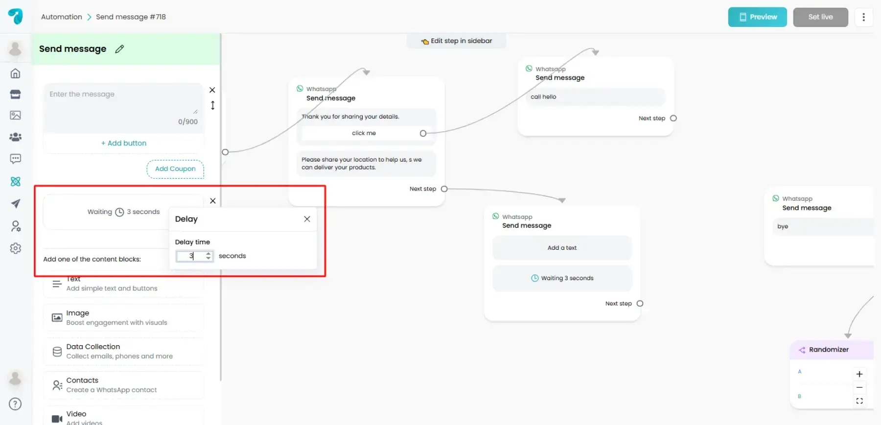 Preview your automation in WhatsApp. You will observe the chatbot “thinking” a bit before it sends you its next reply. It makes the dialogue sound more natural and conversational.