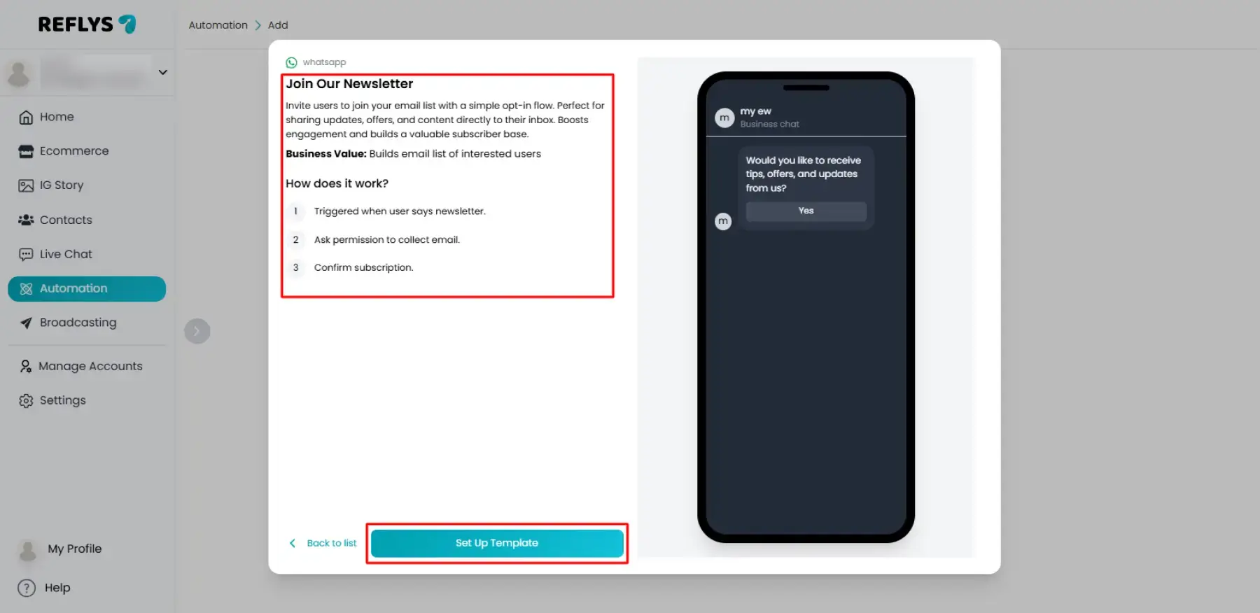 Reflys automation templates are designed to save your time and ease your working processes. You can select from our ‘Ready-to-Go Templates’ instead of building everything from scratch. These templates are created for specific channels and industries; thus, you may choose the one that aligns with your needs and then customize it according to your style.