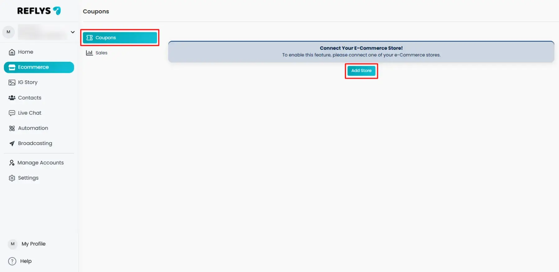 Note: You can only connect one E-commerce connection at a time with Reflys. It means you can link either WooCommerce, Shopify, or BigCommerce, but not all at once. If you are previously connected to a store and you want to connect to another store, you must disconnect from it first to connect to a new one.