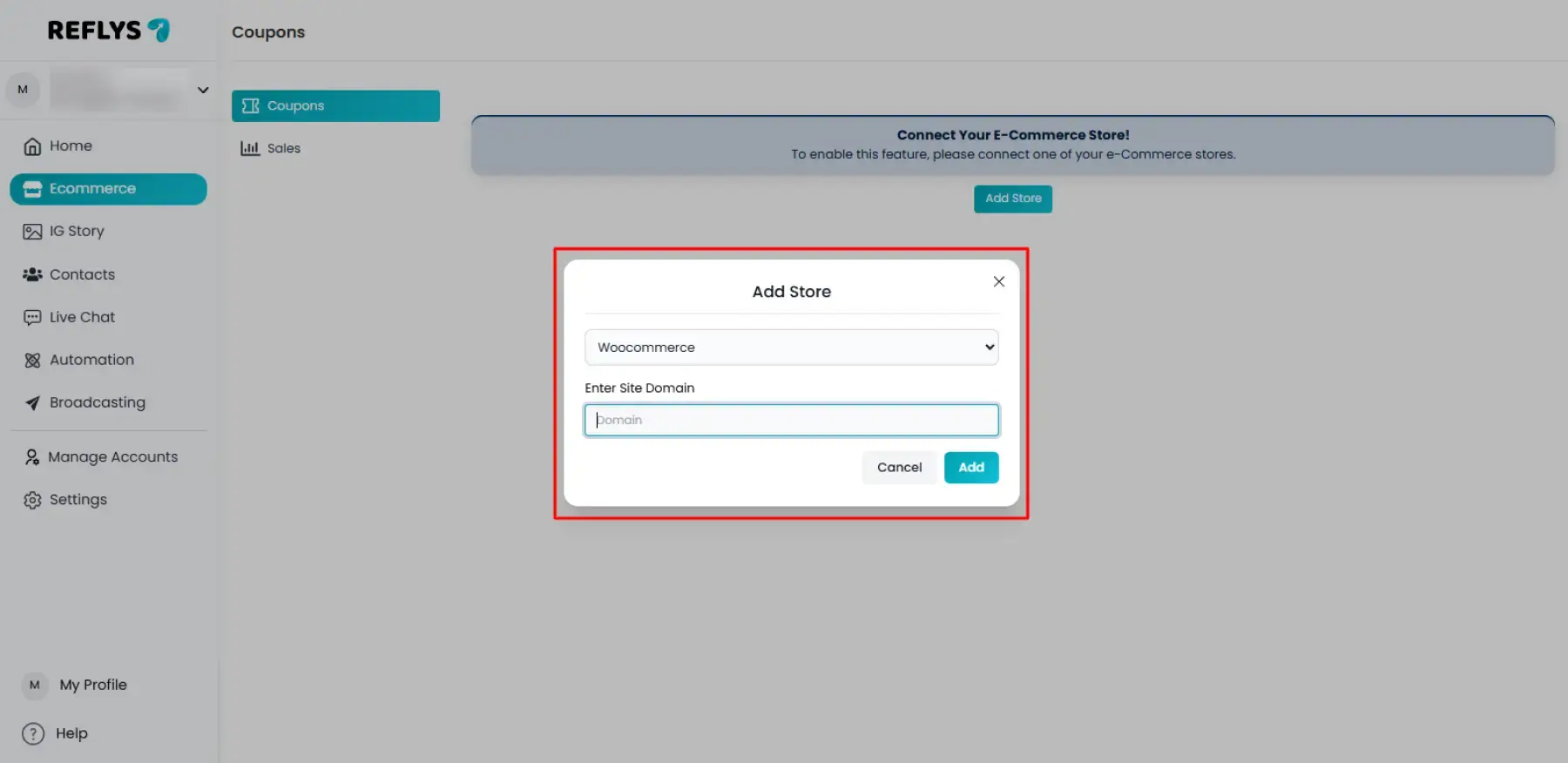 Once you have chosen WooCommerce, Reflys will require the domain of your store (the URL of your WooCommerce site).