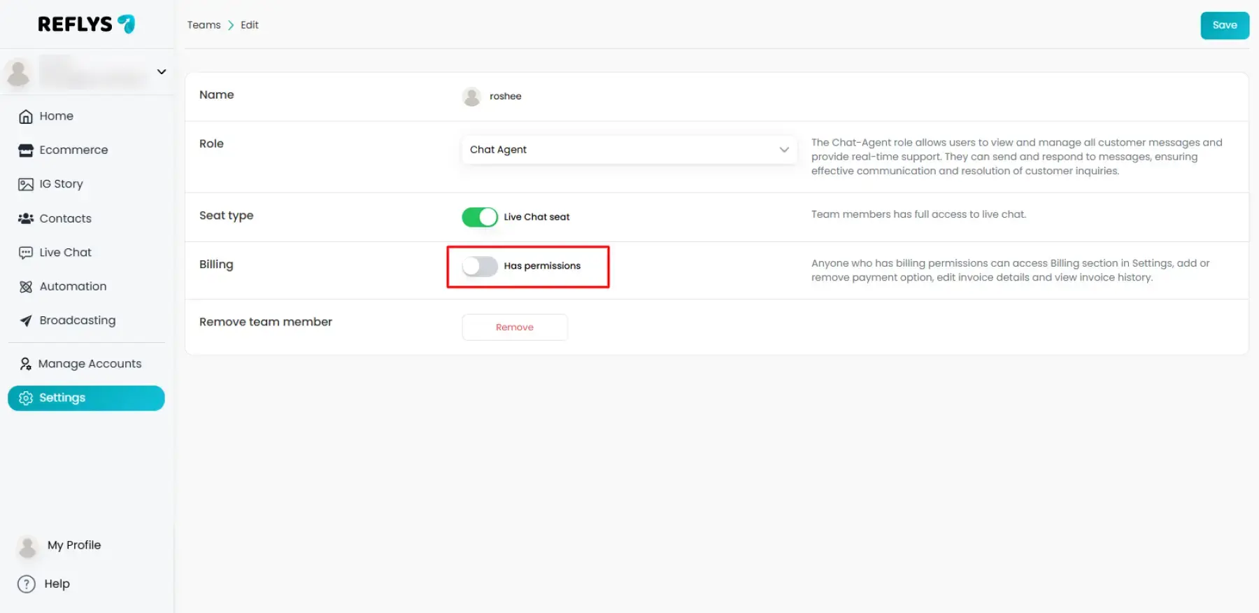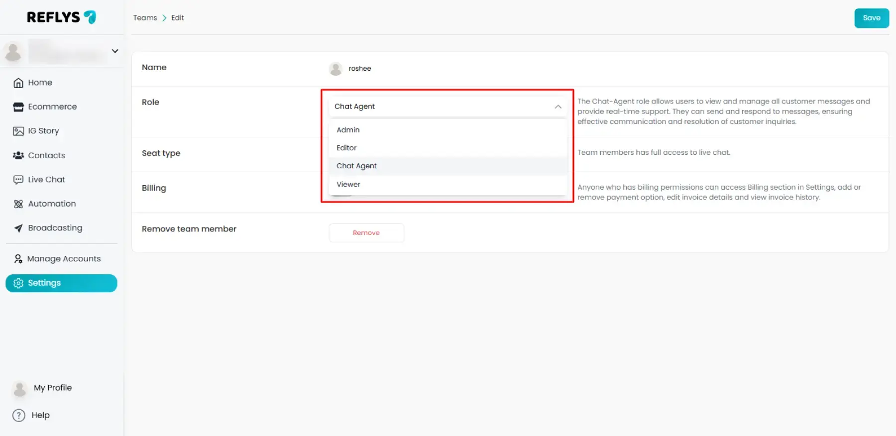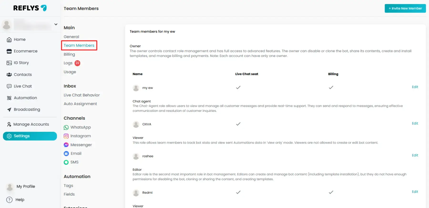 The user roles and team access management by Reflys ensure easy collaboration and secure account handling. As your business grows, you can involve team members to manage the process of automating tasks, handling customer chats, and reviewing reports. With Reflys, it is easy to assign different roles with specific permissions, ensuring everyone on your team is aware of their access rights.